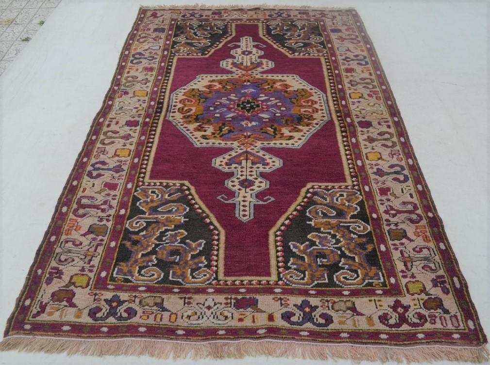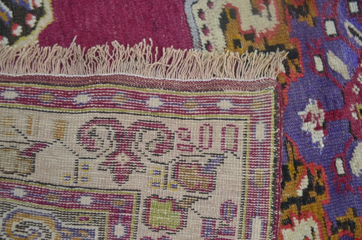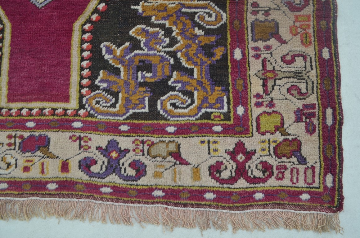 1.95x1.23=2.40 m2, 90-100 YIL ESKİ MUHTEŞEM MOR RENKLERLE DOKUNMUŞ KARAKTERİSTİK NADİR ÇIKAN MADEN HALISI KÖK BOYA VE EL İPİYLE DOKUNMUŞTUR.KATALOG PARÇADIR.KONDÜSYONU SÜPERDİR.