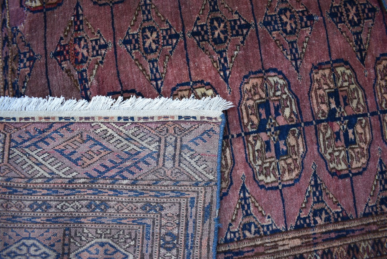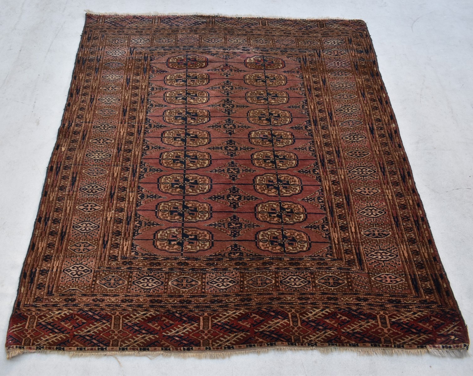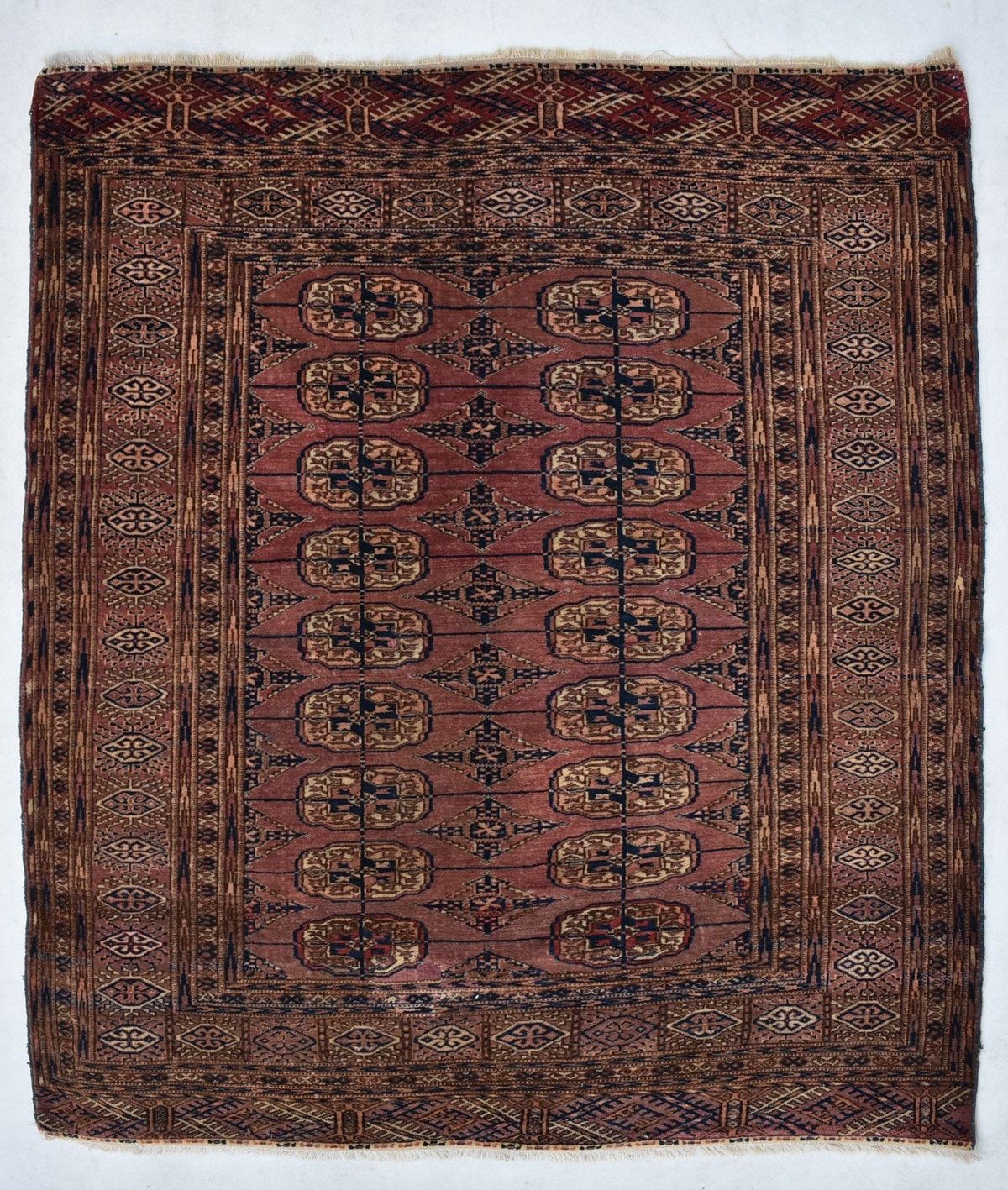 1.37x1.15=1.58m2, 130-140 YIL ESKİ, SÜPER İŞÇİLİKLE DOKUNMUŞ (1 CM 2’DE 100 DÜĞÜM), EL İPİ, KÖK BOYA, ANTİK, KATALOG, KOLLEKSİYON PARÇANIN SÜPER KONDÜSYONU VAR, TOPRAK TONLARIYLA ZENGİNLEŞTİRİLMİŞ BU NADİDE TÜRKMEN HALISININ BİR KAÇ YERİNDE TAMİR İŞLEMİ YAPILMIŞTIR.