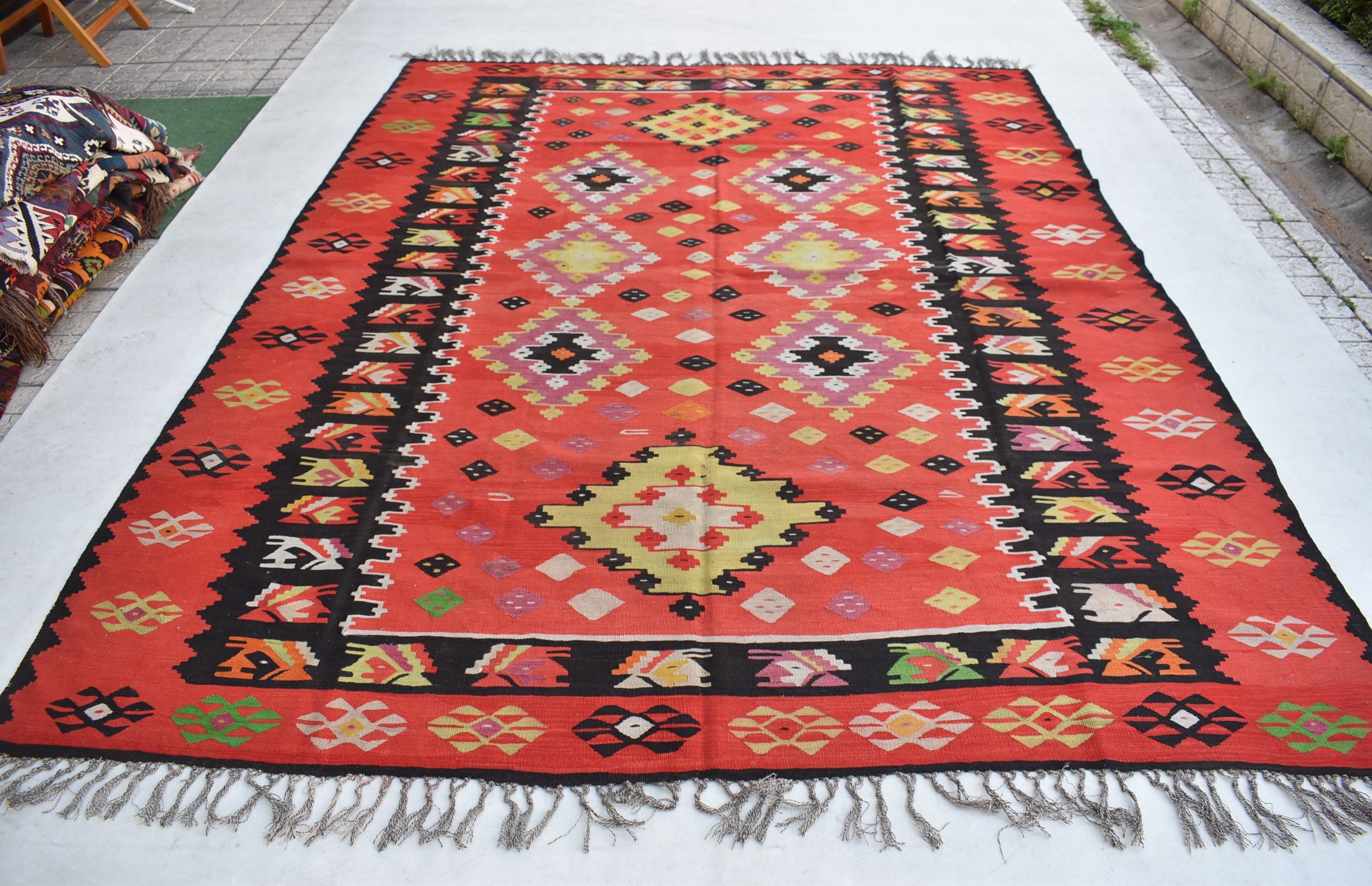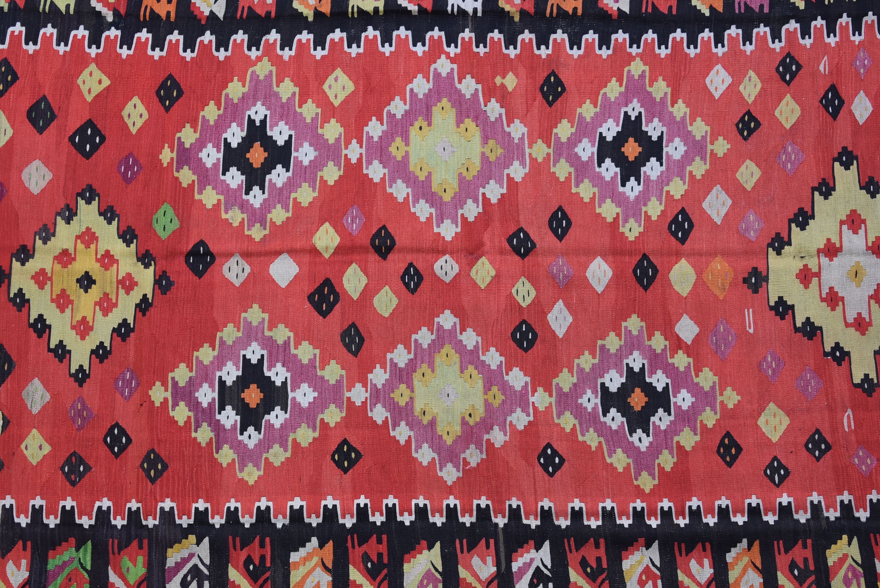 2.90x2.28=6.61, 80-90 YIL ESKİ, ÇEYİZLİK DOKUMA, SÜPER KONDÜSYON, TAMAMI KÖK BOYA, NADİR ÇIKAN ŞARKÖY KİLİMİ, ÇARPICI RENKLERLE DOKUNMUŞ, ÇOK GÜZEL ÖLÇÜ.