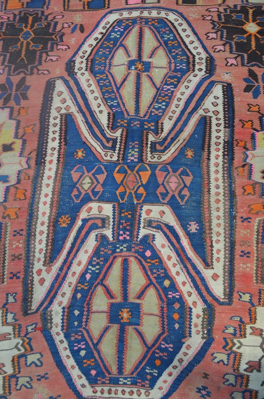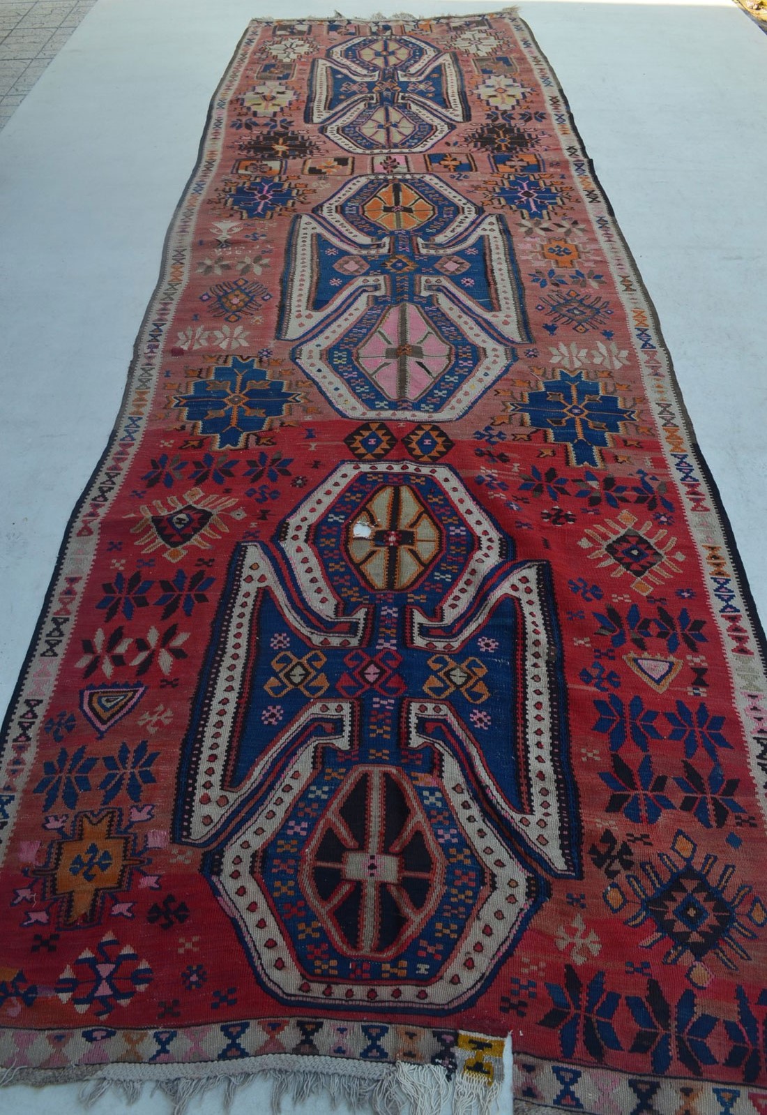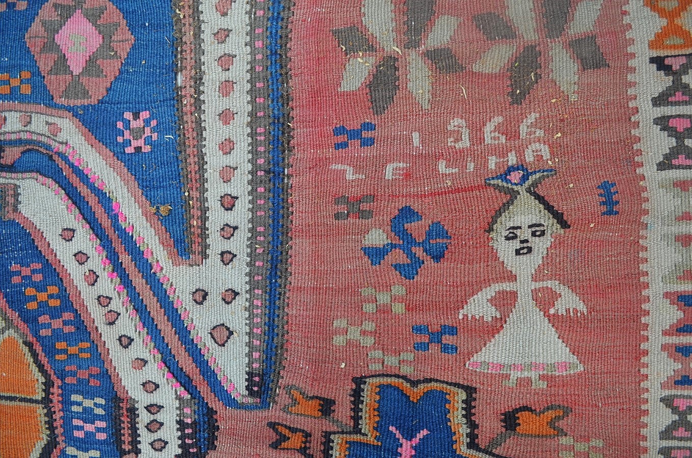 3.92x1.27=4.98 m2, 1966 TARİHLİ, KİRMAN İPİ, KÖK BOYA, GELENEKSEL VAN KİLİMİ MOTİFLERİYLE DOKUNMUŞTUR, KALİTESİ VE KONDÜSYONU GÜZELDİR, DOKUYANIN İSMİ VE KIZ ÇOÇUĞU MOTİFİ MEVCUTTUR, YOLLUK ÖLÇÜSÜDÜR.