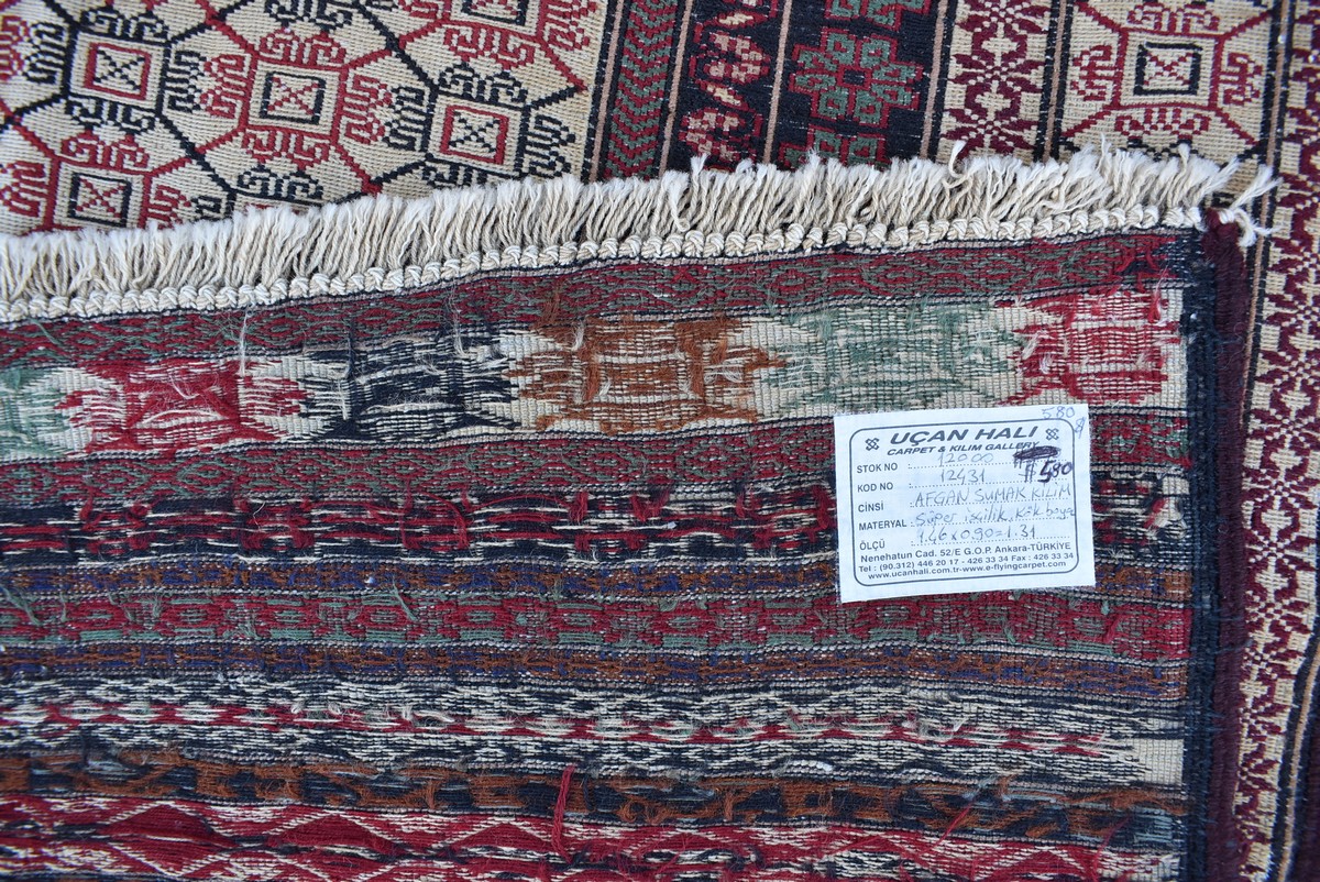 1.46x0.90=1.31, 20-30 YIL ESKİ, SUMAK TEKNİKLE DOKUNMUŞ KÖK BOYA SÜPER İNCE AFGAN KİLİMİ NADİR DOKUMADIR.TAMAMI KÖK BOYA VE EL İPİYLE SÜPER İŞÇİLİKLE DOKUNMUŞTUR.