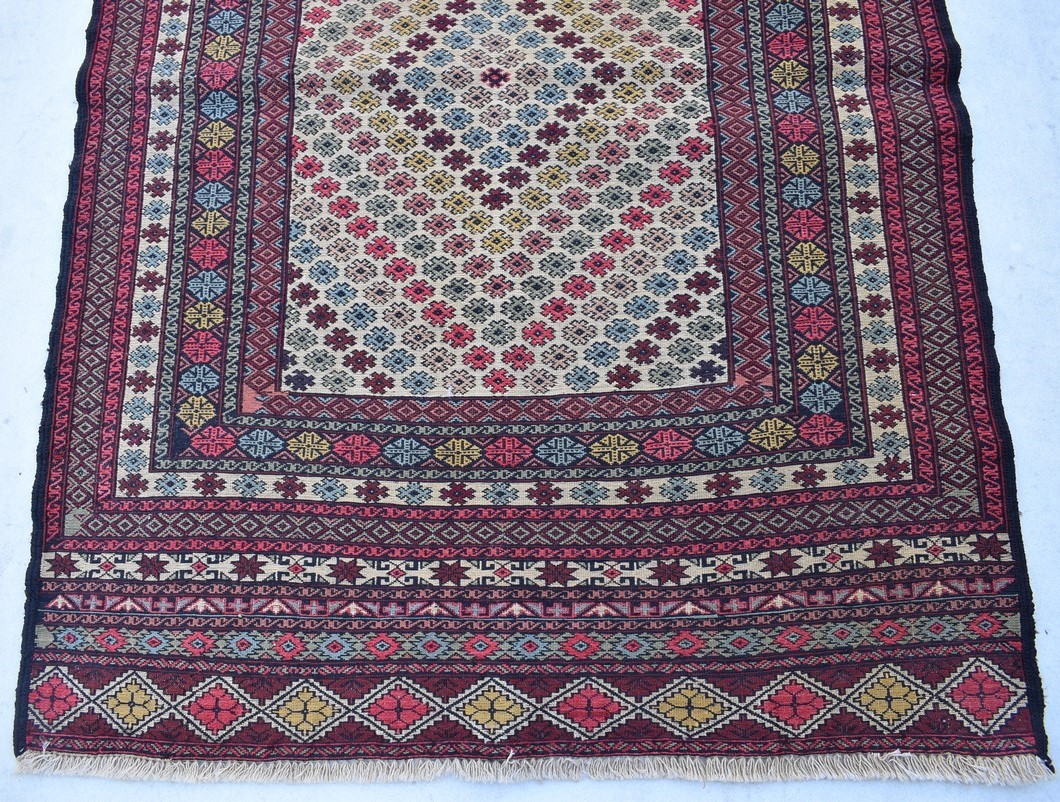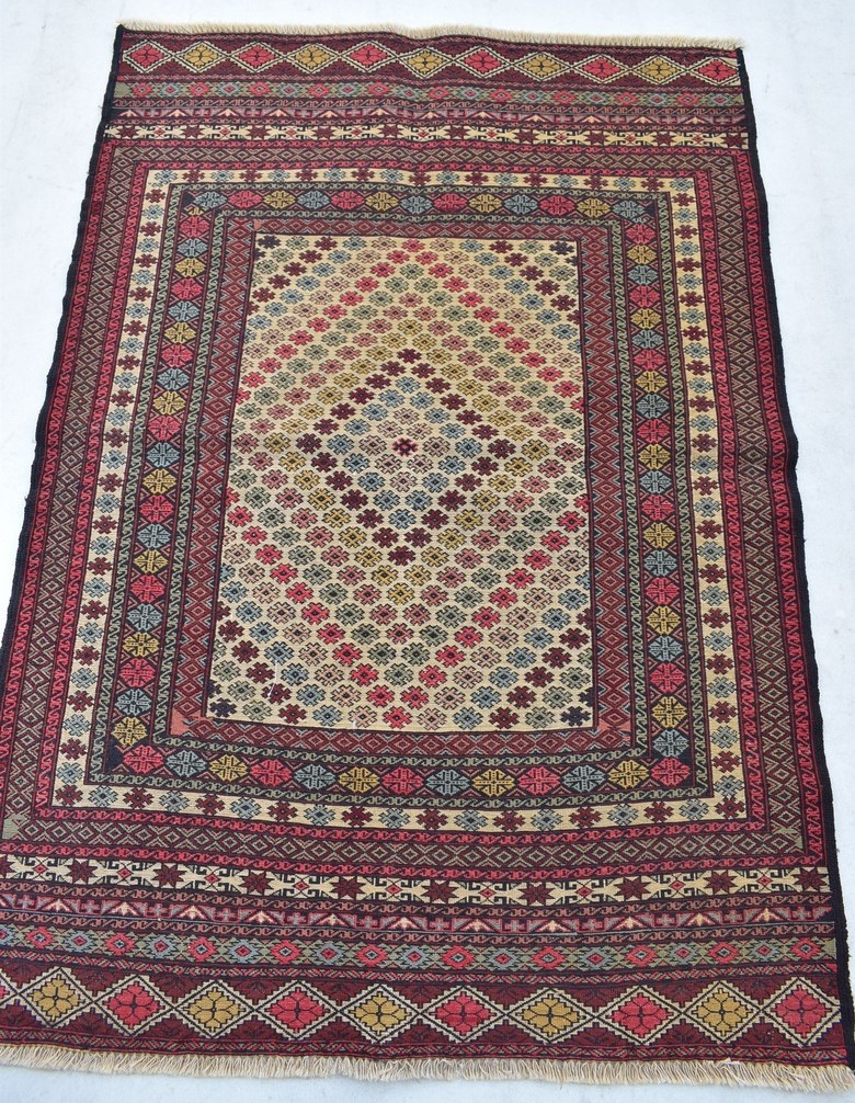 1.37x0.95=1.30, 20-30 YIL ESKİ, SUMAK TEKNİKLE DOKUNMUŞ KÖK BOYA ÇOK NADİR DOKUNAN SÜPER İNCE AFGAN KİLİMİNİN MUHTEŞEM RENK VE DESENLERİ MEVCUT.