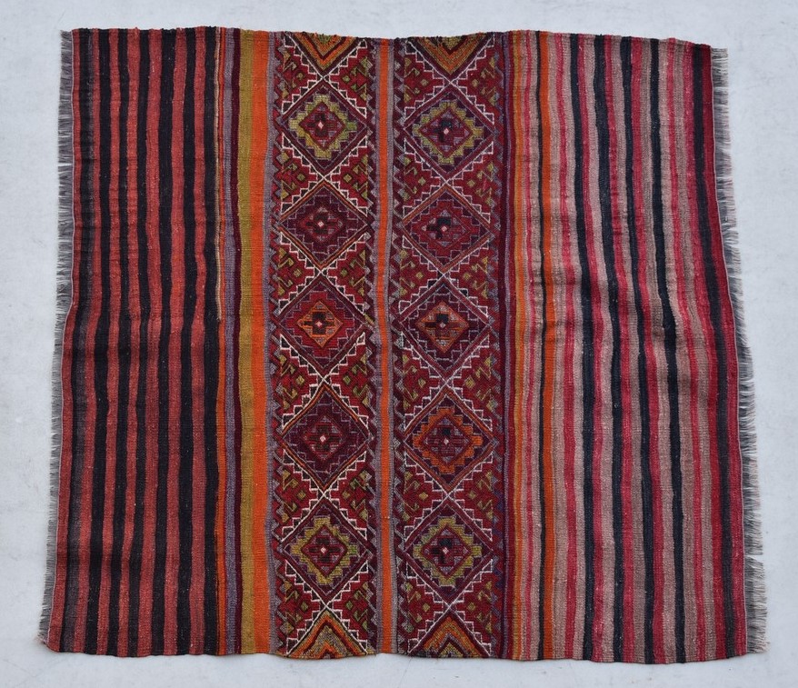 1.43x1.25=1.79, 40-50 YIL ESKİ, SUMAK VE DÜZ KİLİM DOKUMA, KÖK BOYA, AÇIK ÇUVAL ŞEKLİNDEDİR, ÇEYİZLİK OLARAK DOKUNMUŞTUR.