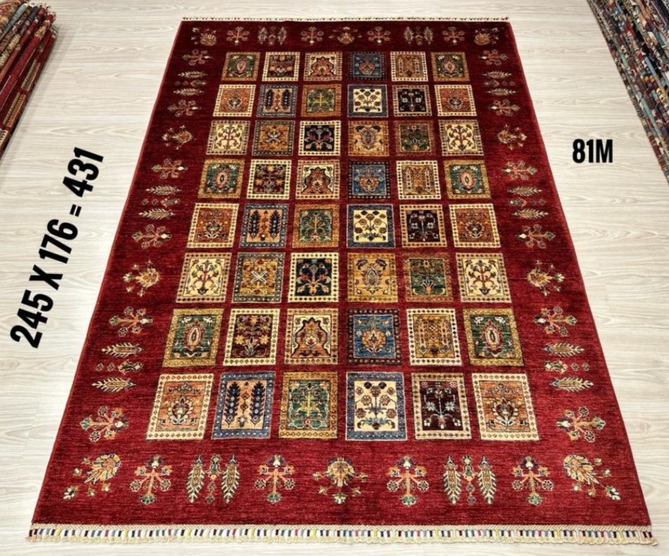 2.45x1.76=4.31, MÜKEMMEL BİR İŞÇİLİK SUNAN BU YENİ ŞİRVAN HALISININ SÜPER KALİTE PARLAK YÜNÜ VAR. TAMAMI KÖK BOYAYLA DOKUNMUŞ VE "AYNA" DESENİ VE SEVİLEN HAYAT AĞACI MOTİFLERİ KULLANILMIŞTIR. ŞAHANE DESEN VE ZEMİNDE MUHTEŞEM KIRMIZI RENK. TANITIM FİYATIYLA SİTEMİZDE VE ÖZEL İNDİRİMLİDİR.