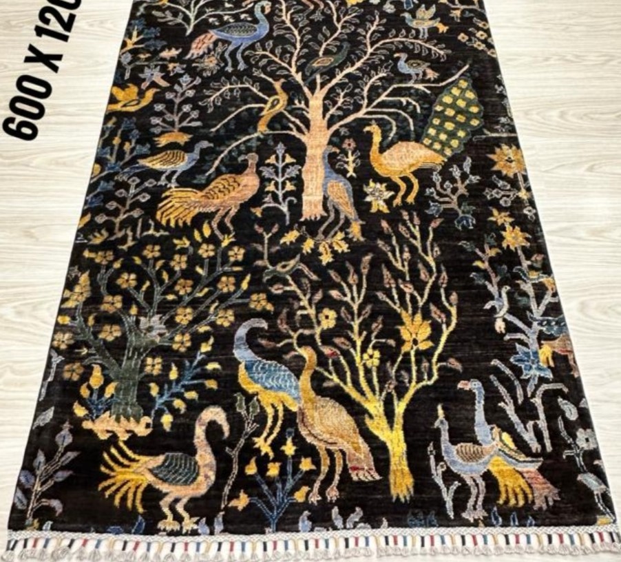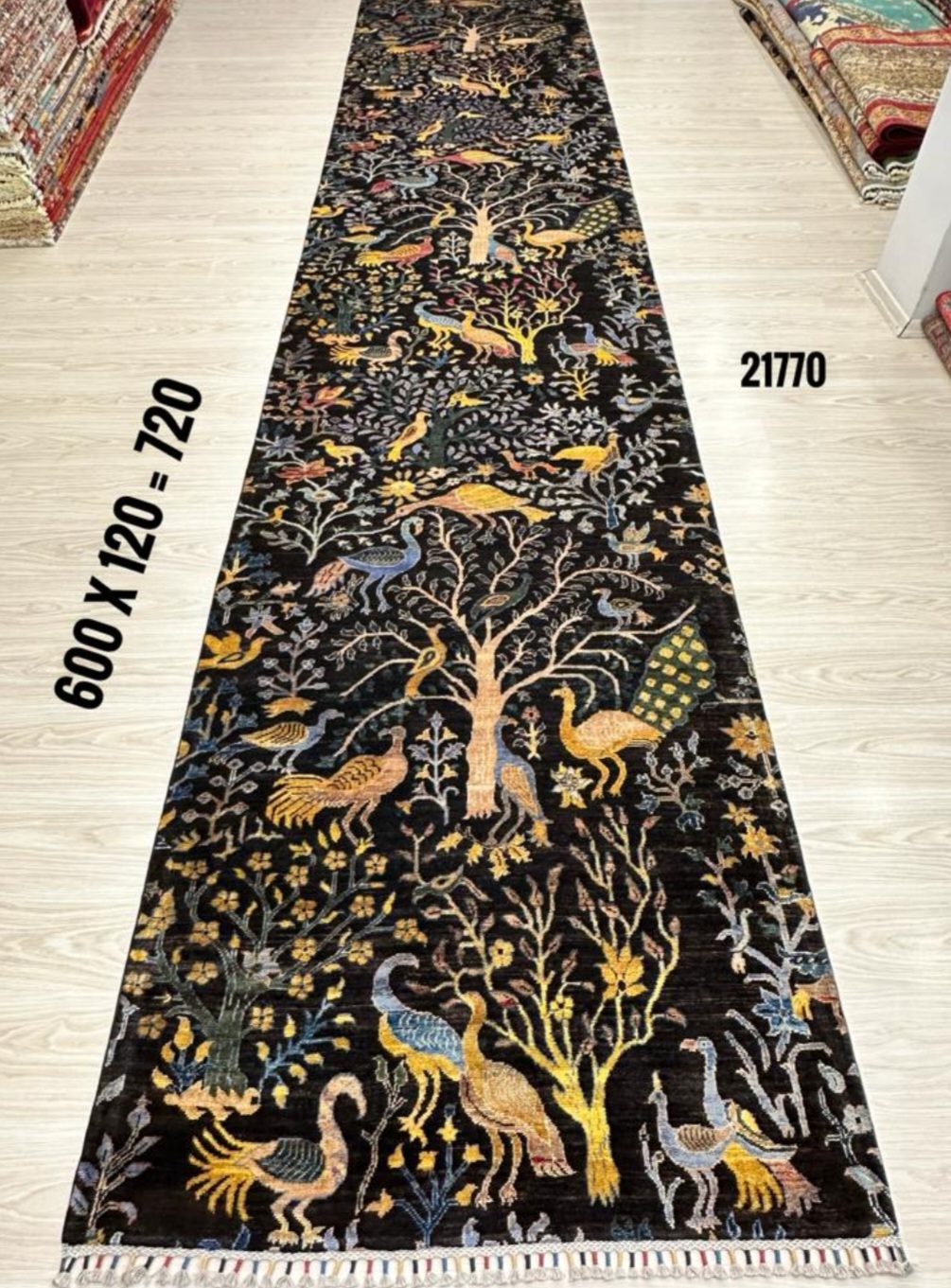6.00x1.20=7.20, MÜKEMMEL BİR İŞÇİLİK SUNAN BU YENİ "ŞİRVAN" HALISININ SÜPER KALİTE PARLAK YÜNÜ VAR. TAMAMI KÖK BOYAYLA DOKUNMUŞ VE "KUŞLU VE HAYAT AĞAÇLI" DESENİ KULLANILMIŞTIR. ŞAHANE NADİR SİYAH ZEMİN RENK VE ÇOK NADİR DOKUNAN ÖLÇÜ.