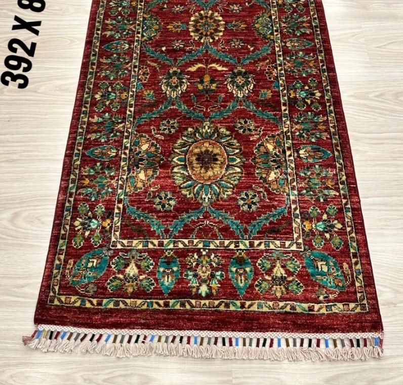 3.92x0.84=3.29, MÜKEMMEL BİR İŞÇİLİK SUNAN BU YENİ ŞİRVAN HALISININ SÜPER KALİTE PARLAK YÜNÜ VAR, TAMAMI KÖK BOYAYLA DOKUNMUŞ VE ÇOK NADİR "MEMLUK" DESENİ KULLANILMIŞTIR.AFGAN GAZNE YÜNÜ KİRMAN İPİYLE DOKUNMUŞTUR.MODERN ÇİZGİLERLE MUHTEŞEM BORDO-TURKUAZ RENK TONLARI KULLANILMIŞTIR.