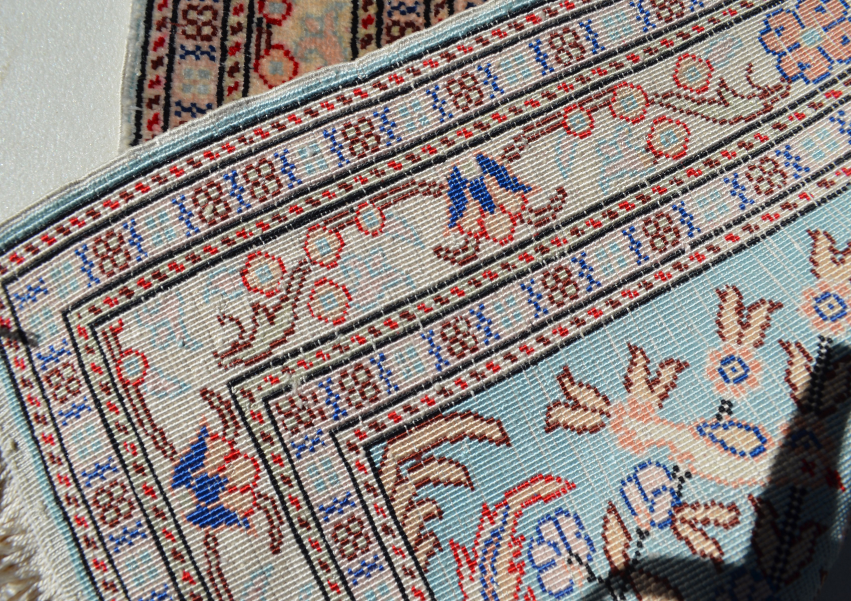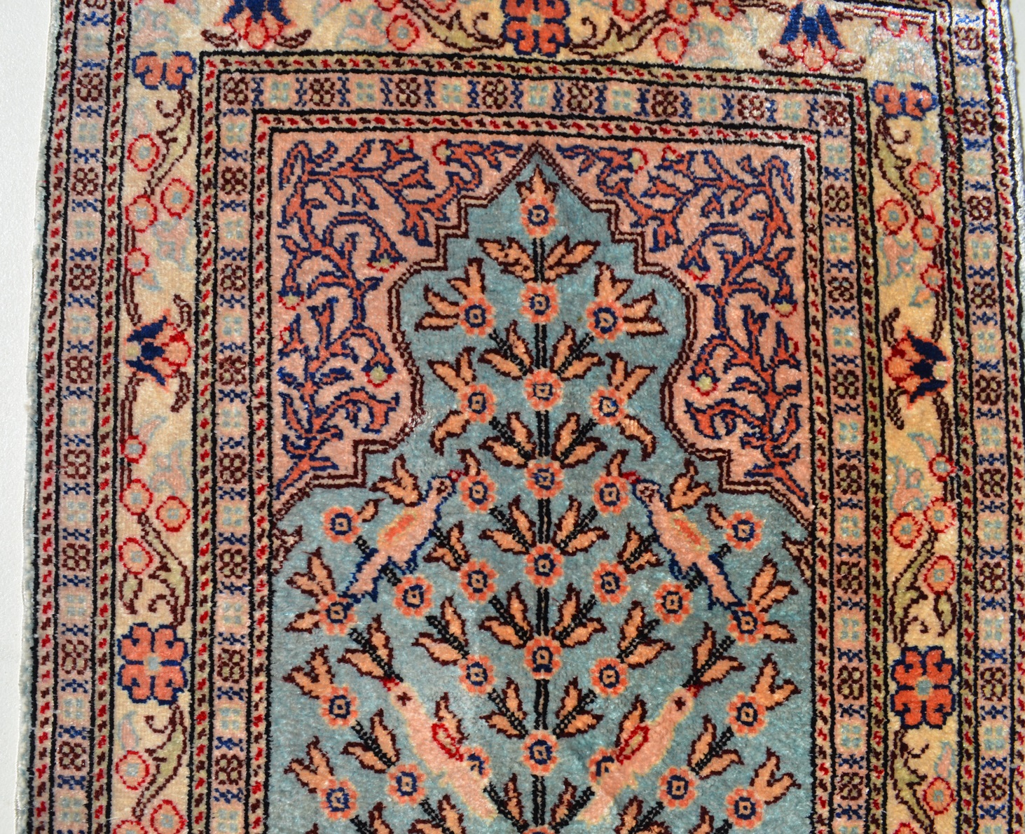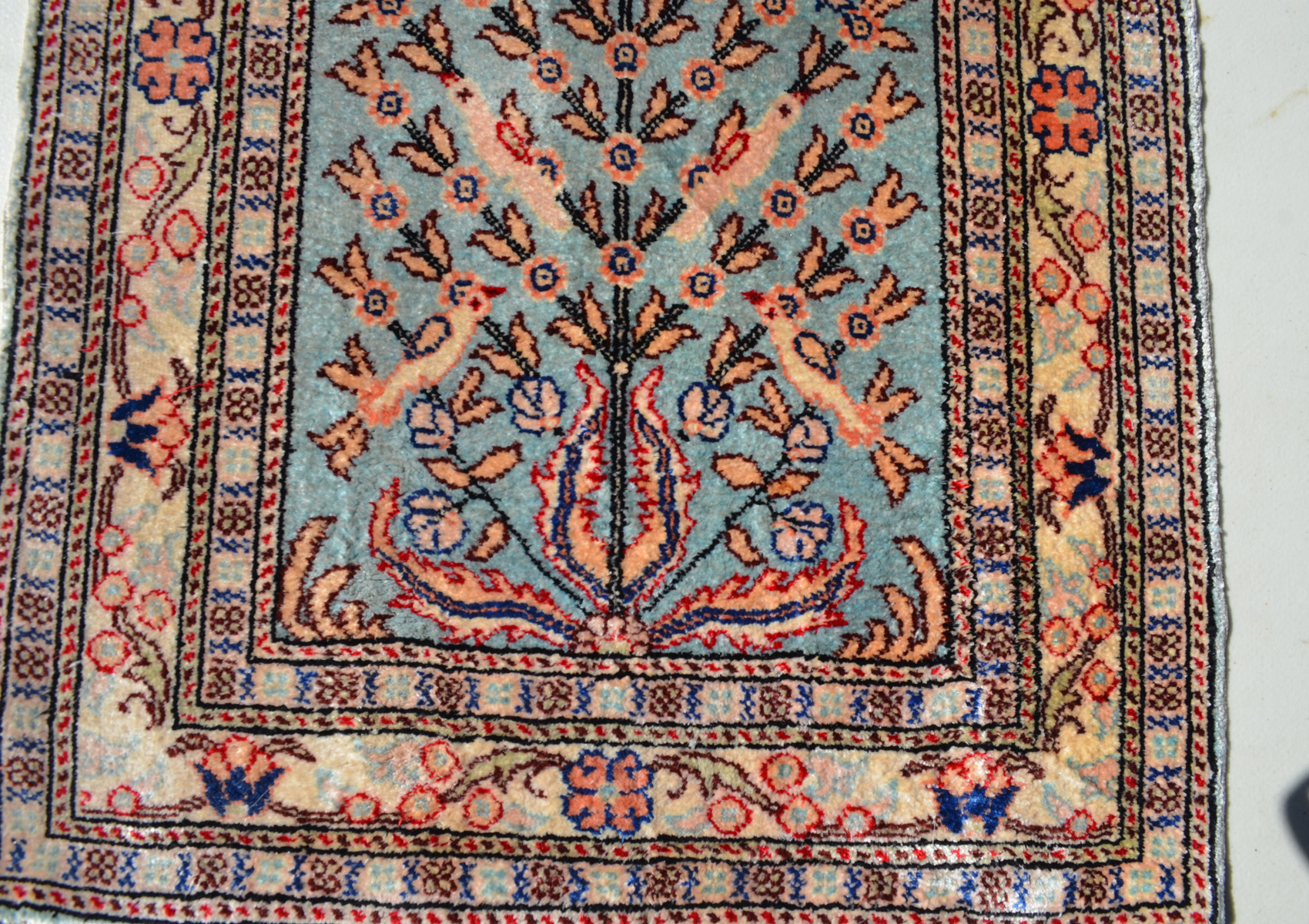 0.57x0.41=0.25 m2, 1cm2=81 DÜĞÜM BULUNAN SÜPER KALİTE KAYSERİ İPEK HALISINDA SEVİLEN HAYAT AĞACI VE KUŞLU DESEN KULLANILMIŞ.SÜPER UYGUN FİYAT.