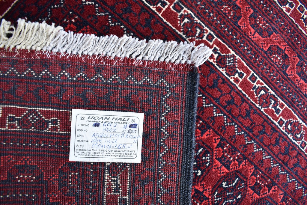 1.50x1.04=1.52, YENİ,SÜPER İŞÇİLİK VE MALZEMEYLE DOKUNMUŞ, 1 cm²’DE 64 DÜĞÜM BULUNAN ÇOK NADİR, TAMAMI EL İPİ VE KÖK BOYA AFGAN HOCA ROŞNAİ HALISI.