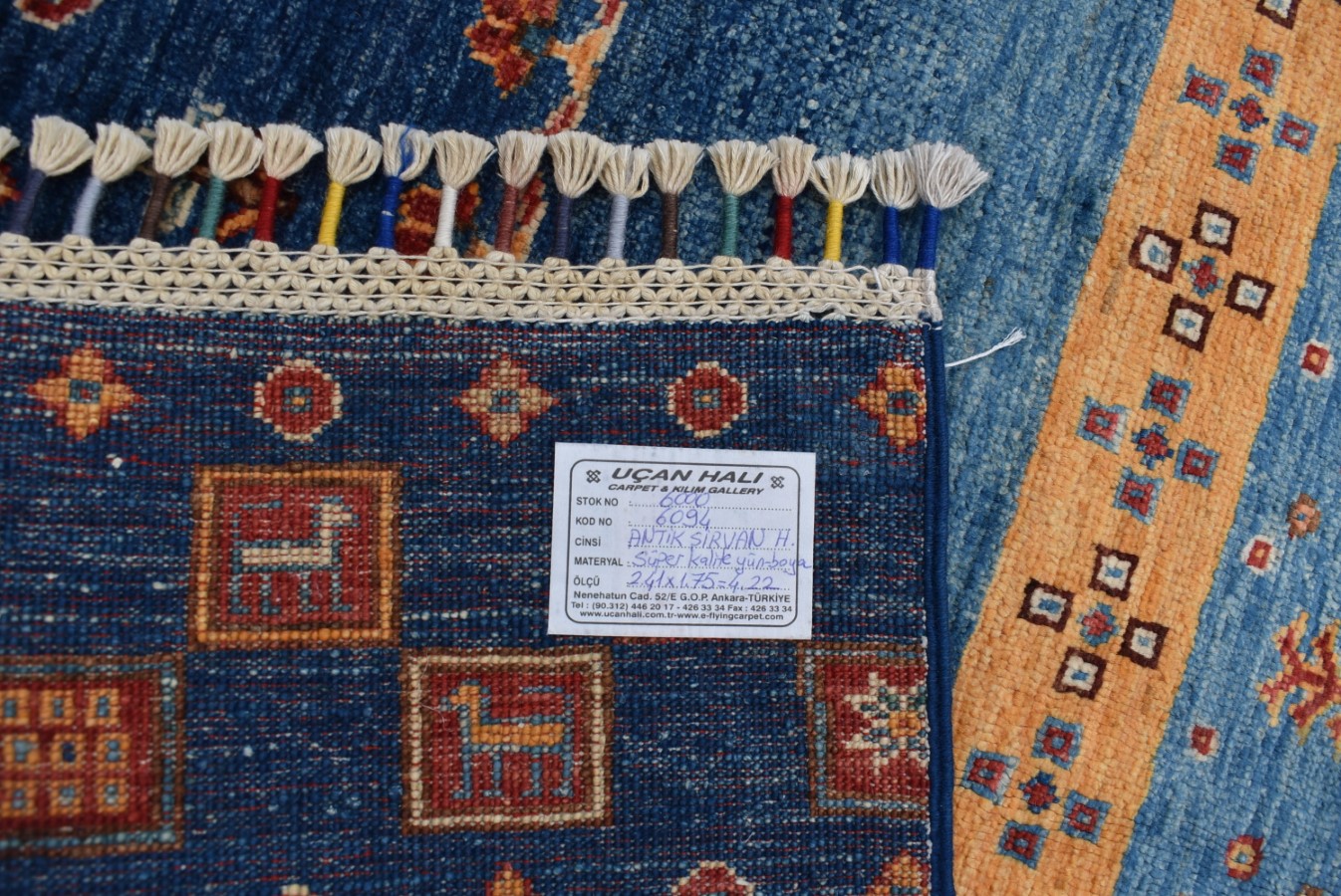 2.41x1.75=4.22, MÜKEMMEL BİR İŞÇİLİK SUNAN BU YENİ ŞİRVAN HALISININ SÜPER KALİTE PARLAK YÜNÜ VAR, TAMAMI KÖK BOYAYLA DOKUNMUŞ VE KAFKAS DESENİ KULLANILMIŞTIR.AFGAN GAZNE YÜNÜ KİRMAN İPİYLE DOKUNMUŞTUR.MODERN ÇİZGİLERLE MUHTEŞEM RENK VE DESENLER KULLANILMIŞTIR.