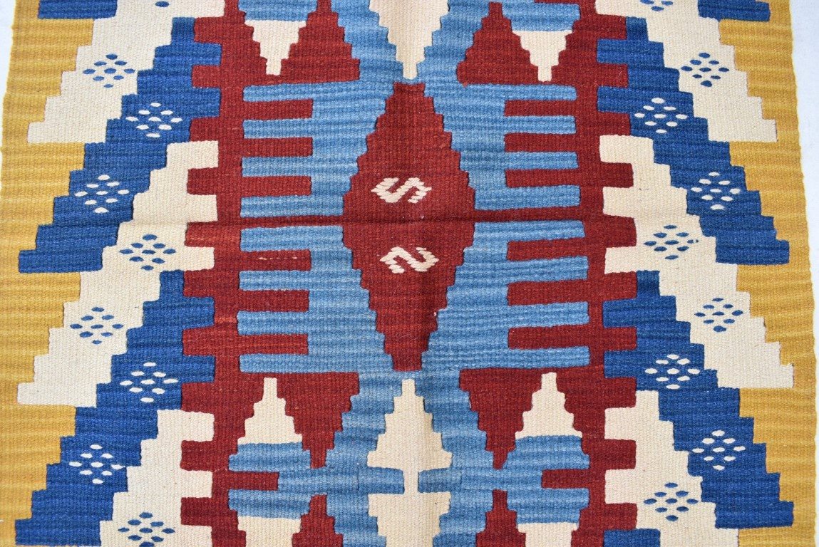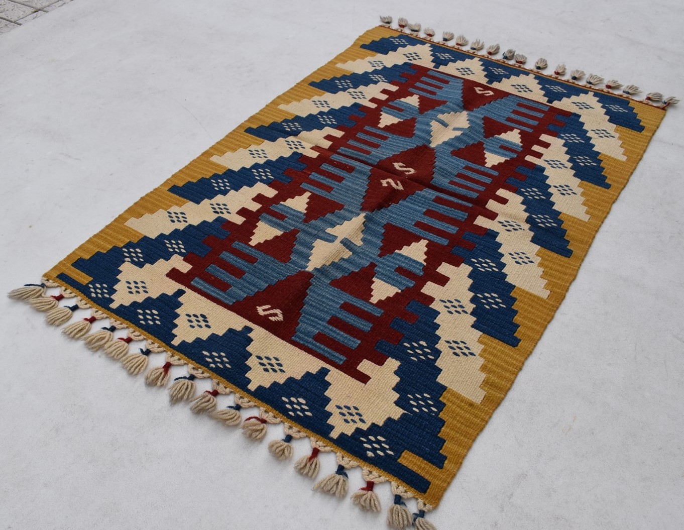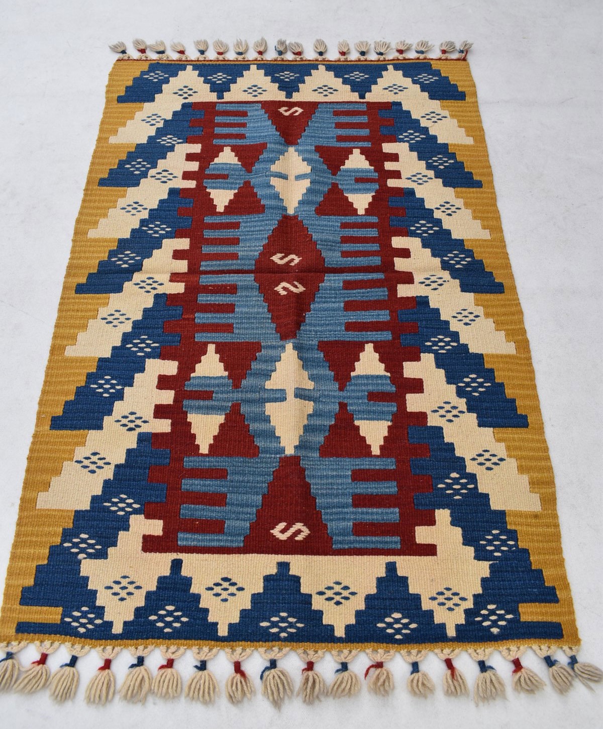 1.18x0.77=0.91 m², KARAKTERİSTİK ANADOLU MOTİFLERİYLE DOKUNMUŞ, TAMAMI YÜN DEKORATİF İYİ KALİTE KAYSERİ KİLİMİ, DEKORATİF SAÇAKLAR.