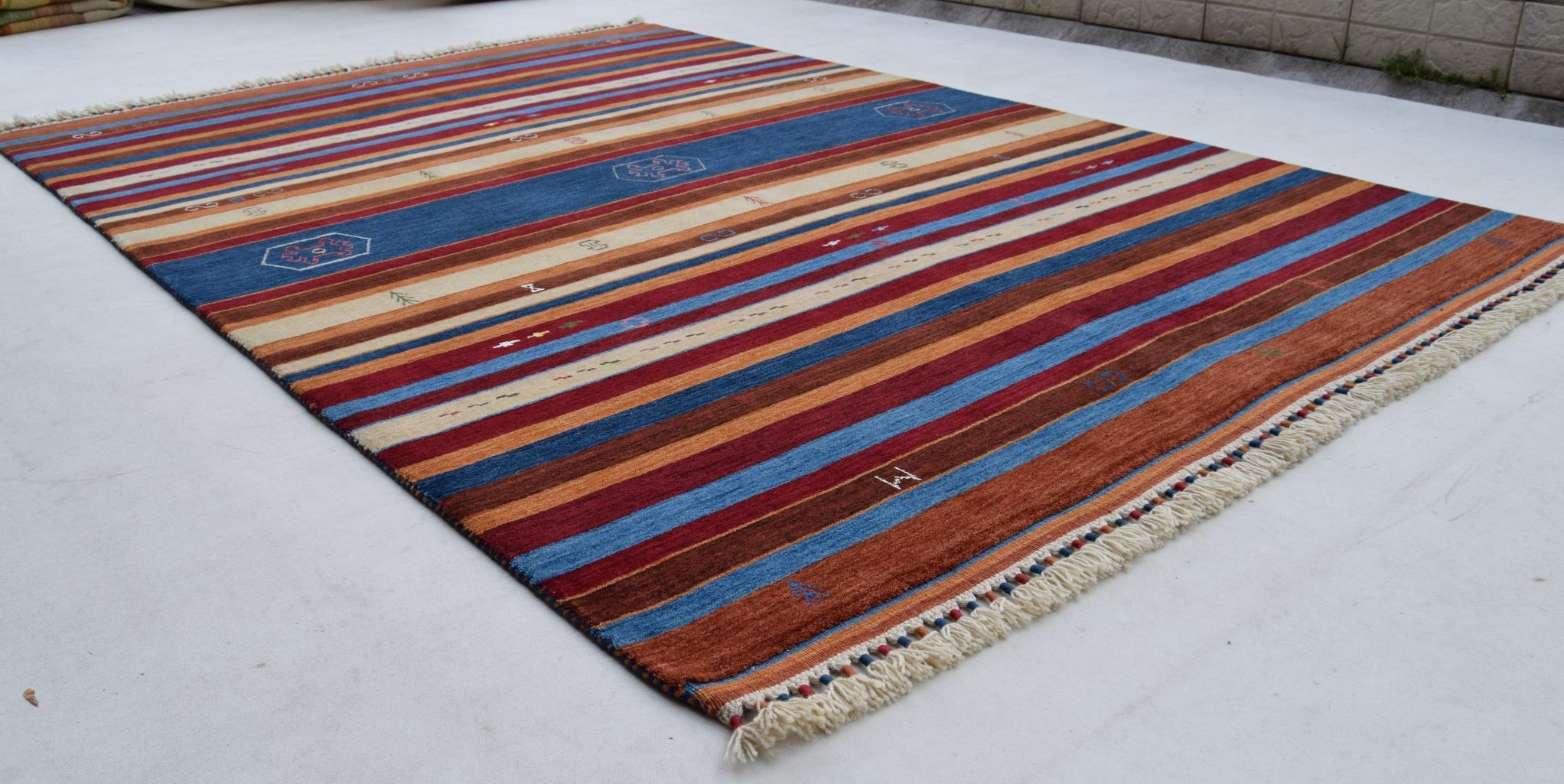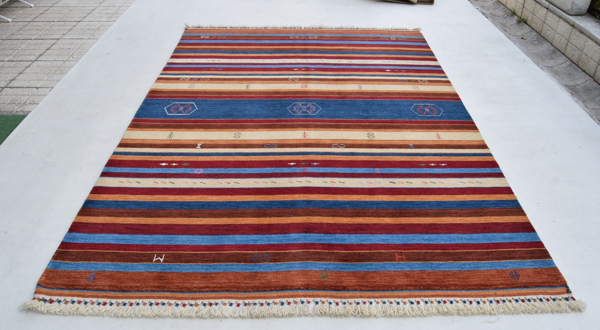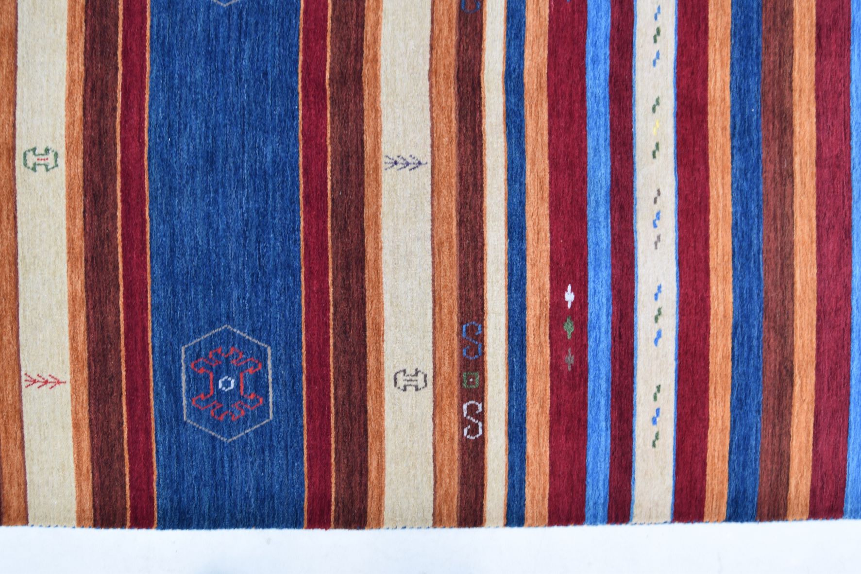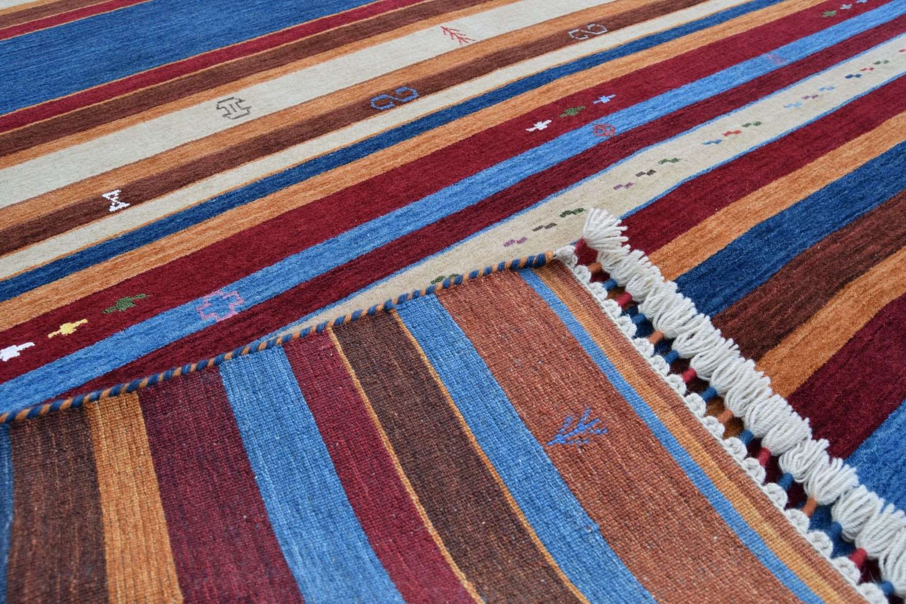 2.43x1.72=4.18 m2, YENİ, SÜPER KALİTE YENİ ZELANDA YÜNÜYLE DOKUNMUŞ MODERN TRIBAL HALISINDA SEVİLEN ÇİZGİLİ DESENLER KULLANILMIŞ.
